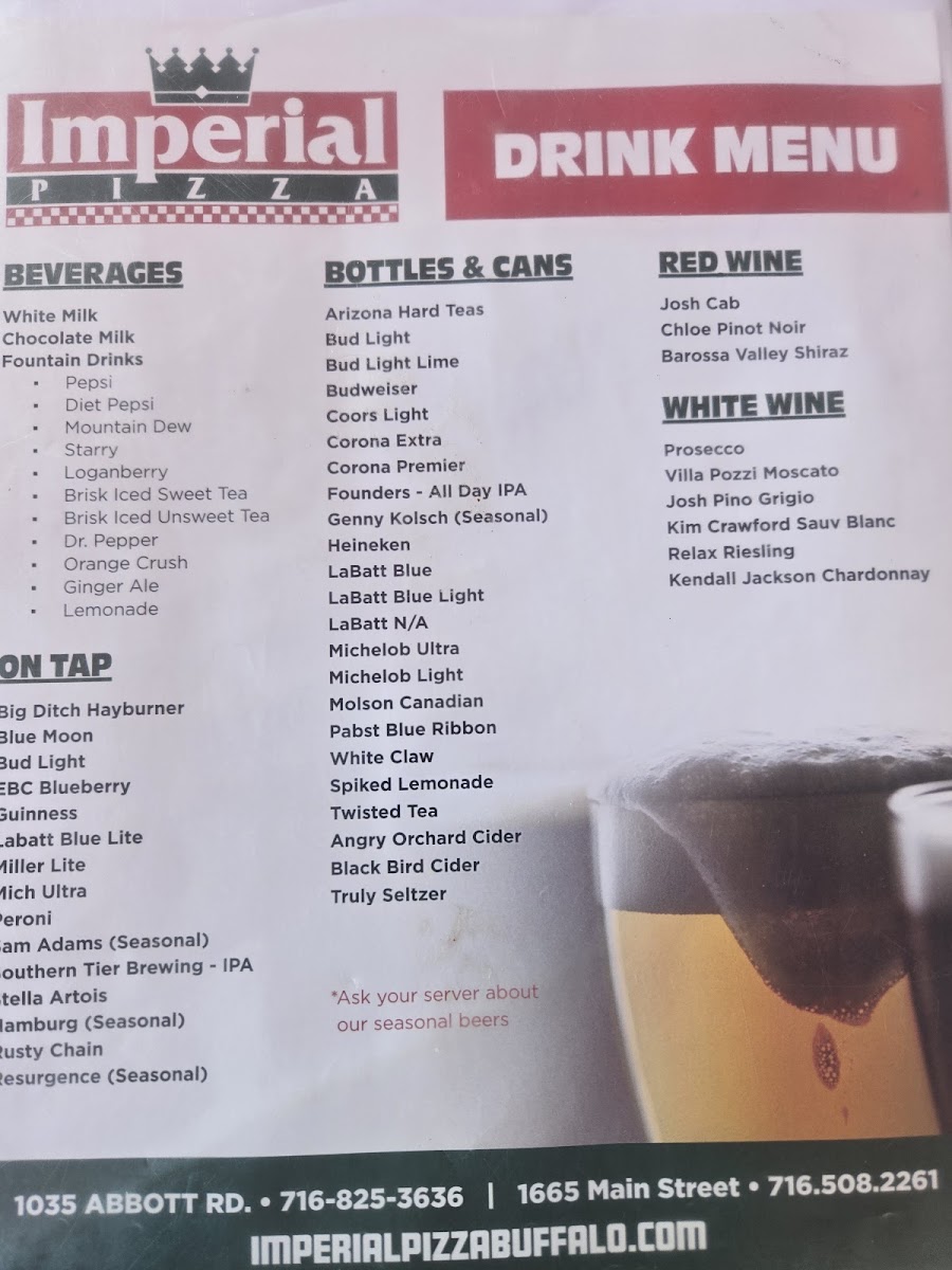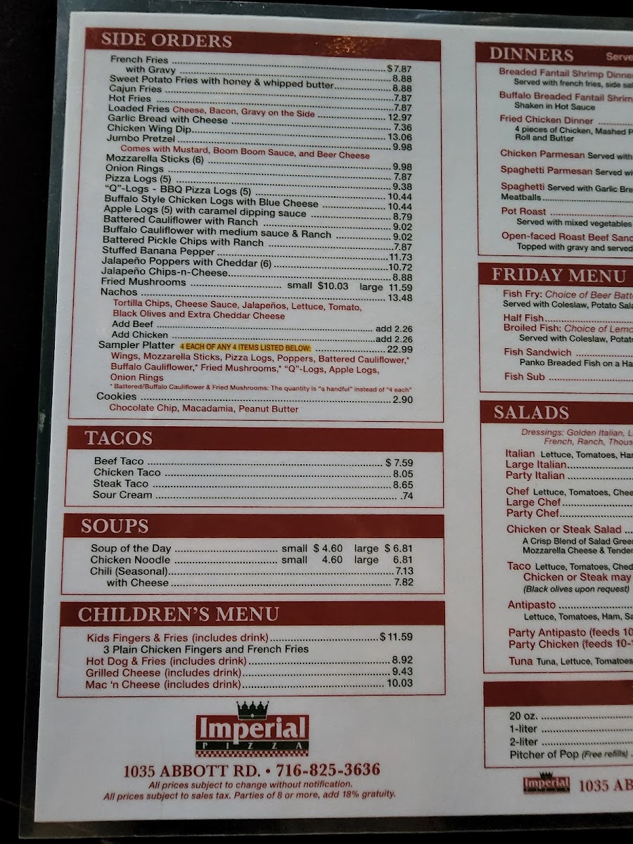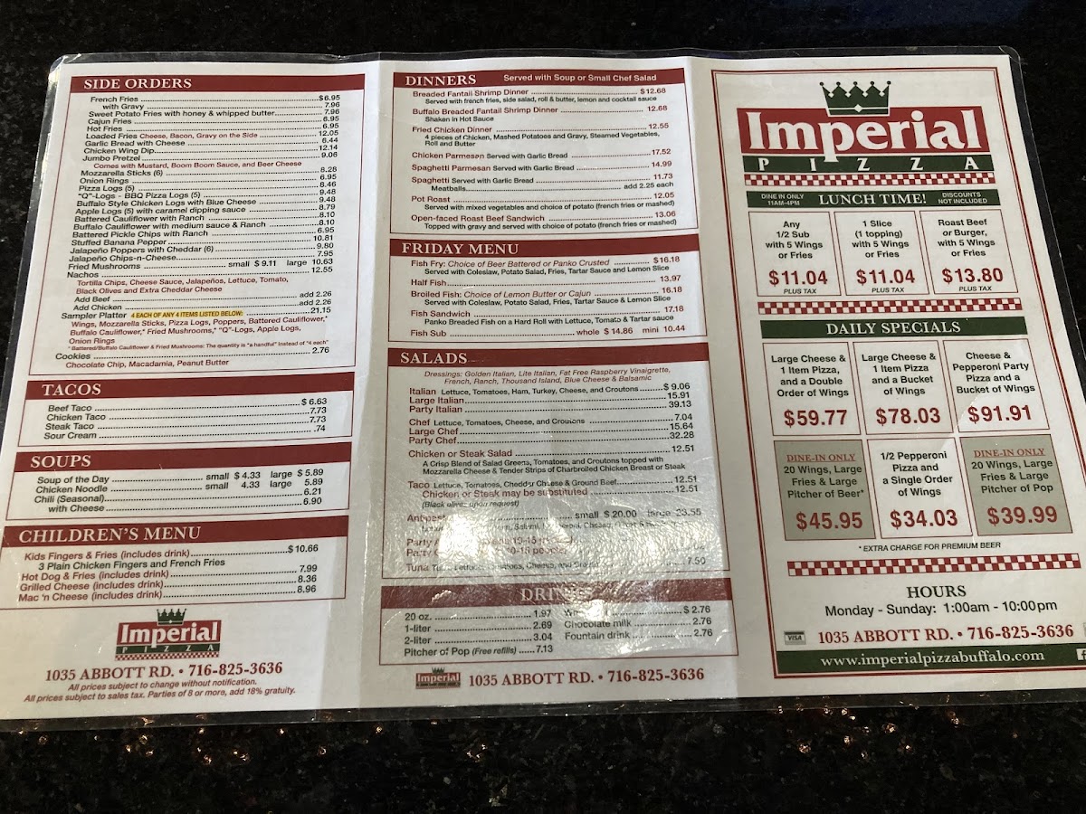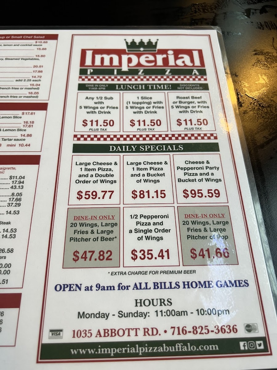 Imperial Pizza - Abbott Road serves a bold and flavorful menu that stands out in Buffalo’s vibrant pizza scene. Their specialty pies push boundaries, like the unique Reuben Pizza with sauerkraut, Swiss cheese, corned beef, and 1,000 Island dressing, blending classic deli flavors with traditional pizza crust. The Stinger Pizza fuses blue cheese or red sauce with chopped steak and chicken fingers, delivering a hearty, indulgent bite. For meat lovers, the Steak Pizza combines mushrooms, onions, hot peppers, steak, and mozzarella for a savory punch, while the White Pizza offers a lighter, herbaceous option with fresh tomatoes and oregano.