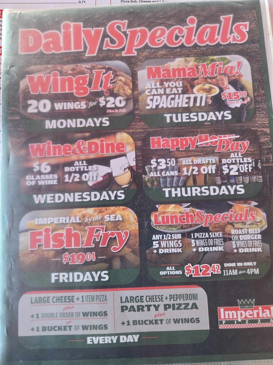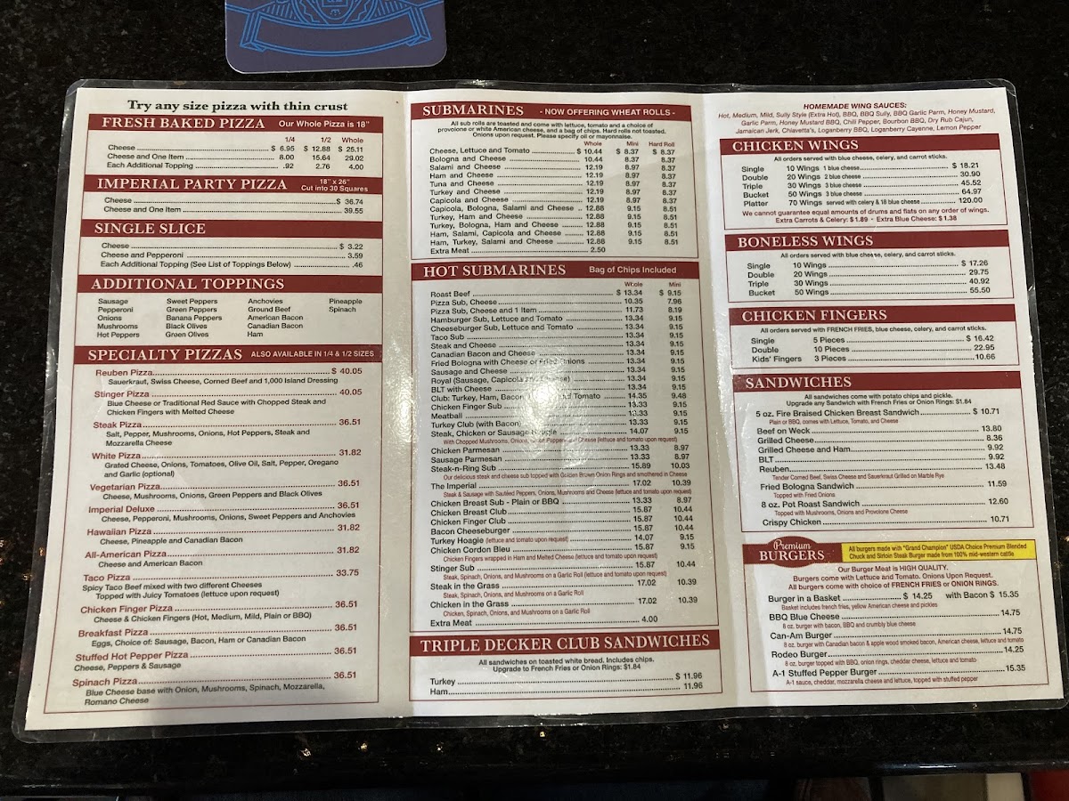 Beyond pizza, Imperial offers crisp and juicy boneless chicken wings and classic fingers paired with crunchy fries and blue cheese—the perfect complement to their pies. Subs here range from simple classics like Turkey & Cheese to hearty combinations like Ham, Salami & Capicola, showcasing the brand’s versatility. Whether you crave innovative toppings or familiar comforts, Imperial Pizza’s menu promises rich, satisfying flavors that keep customers coming back.